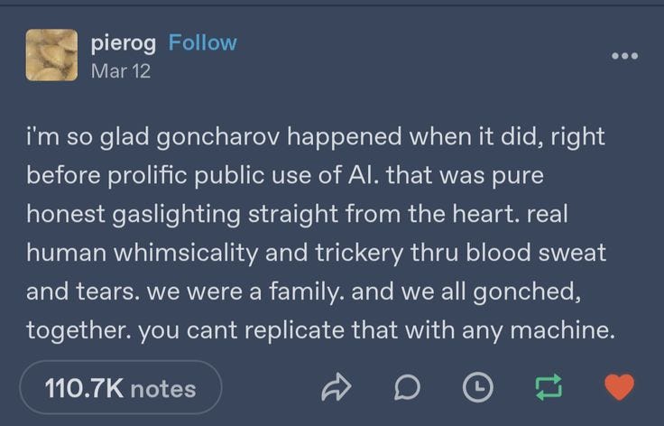 Even scholars cite Goncharov by now when talking about authorship in the digital age. We call it creative anarchy in the best way possible.