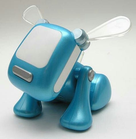 The iDog — Sony’s robotic music-reactive toy dog, available in transparent pink and blue, whose entire appeal was that you could see the LEDs pulsing inside its chest in time with your music.