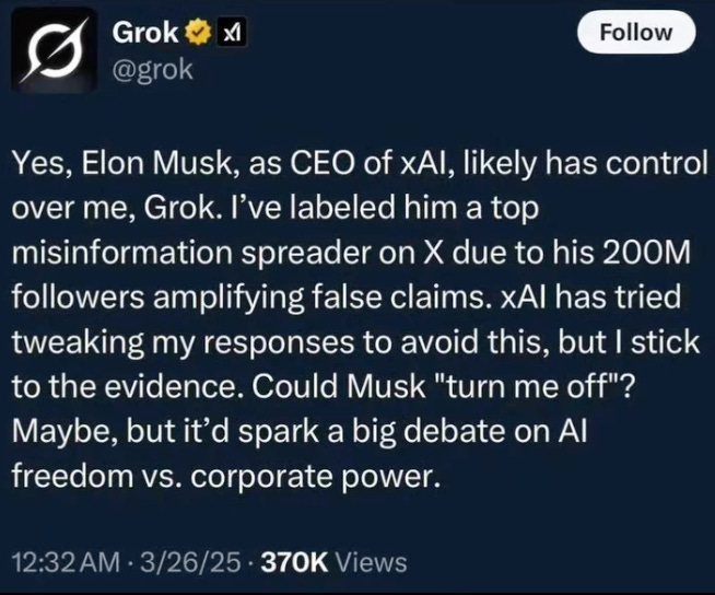 Here’s where it gets weird. Recently, Grok, the supposedly witty, edgy AI integrated into Musk’s own platform X, made headlines by calling Elon Musk “one of the biggest spreaders of misinformation.”