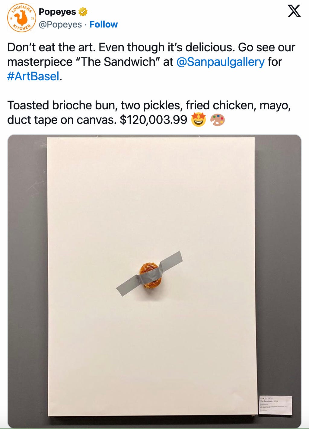 The memes reached new heights. Even Popeyes got in on the action, creating an ad with a chicken sandwich taped to a wall titled "The Sandwich" listed for $120,003.99 (three cents more than the banana).