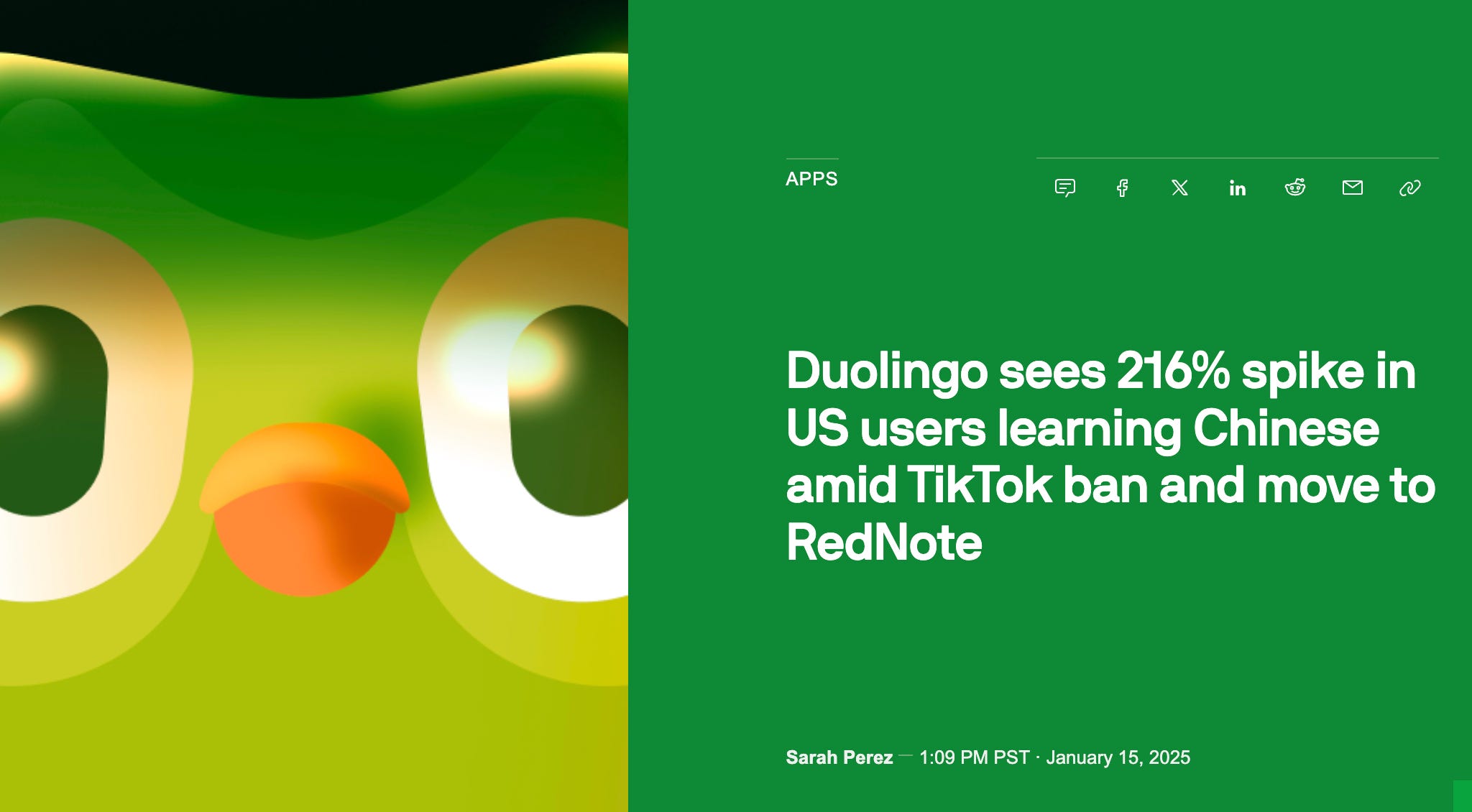 RedNote is a Chinese app that former TikTok users are now downloading en masse. As it’s in Chinese this has led to a truly bizarre situation that has even seen an influx of Americans learning Mandarin via Duolingo. Now that these ex-TikTokers, self-identifying as "TikTok refugees," have migrated, they're completely at the whim of Chinese policy. Their data is even less safe than before and the information they are assimilating is essentially Chinese propaganda.