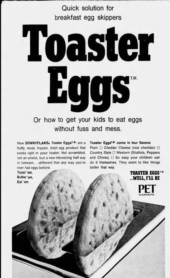 Predictably, they came out looking like industrial insulation and chewing like a stress ball that had seen things. The product died almost instantly, partly because toasters are terrible at heating eggs, and partly because microwave ovens showed up and said, âAbsolutely not, you morons.â Today they live on only in nostalgic lists of âFoods That Should Never Have Happened,â right next to toaster bacon and every other culinary war crime of that decade.