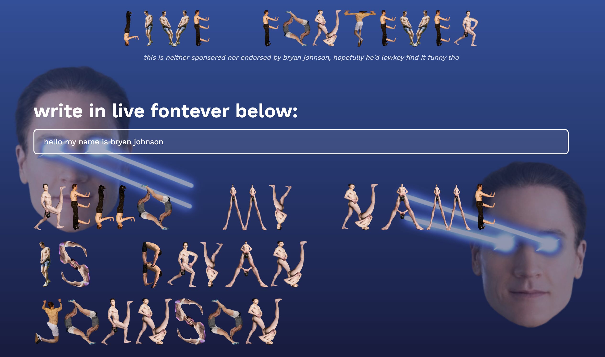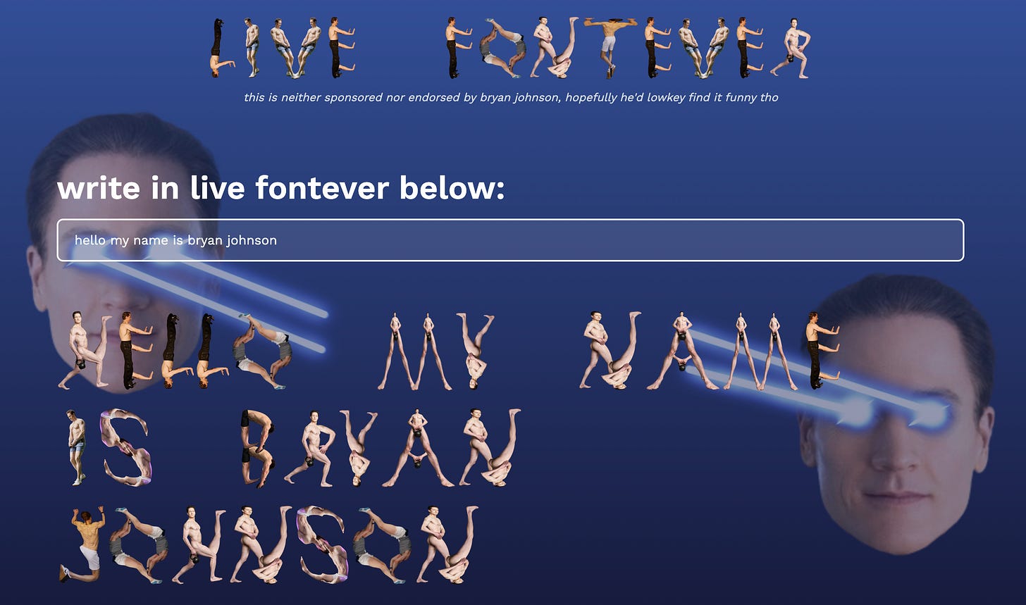 We came across a Note by danielle (𝓇𝒶𝓌 & 𝒻𝑒𝓇𝒶𝓁) where she talked about a hilarious tool she created: livefontever.com. It lets you type with a font made from Bryan Johnson (the millionaire who’s trying to live forever, notorious for swapping blood with his son).