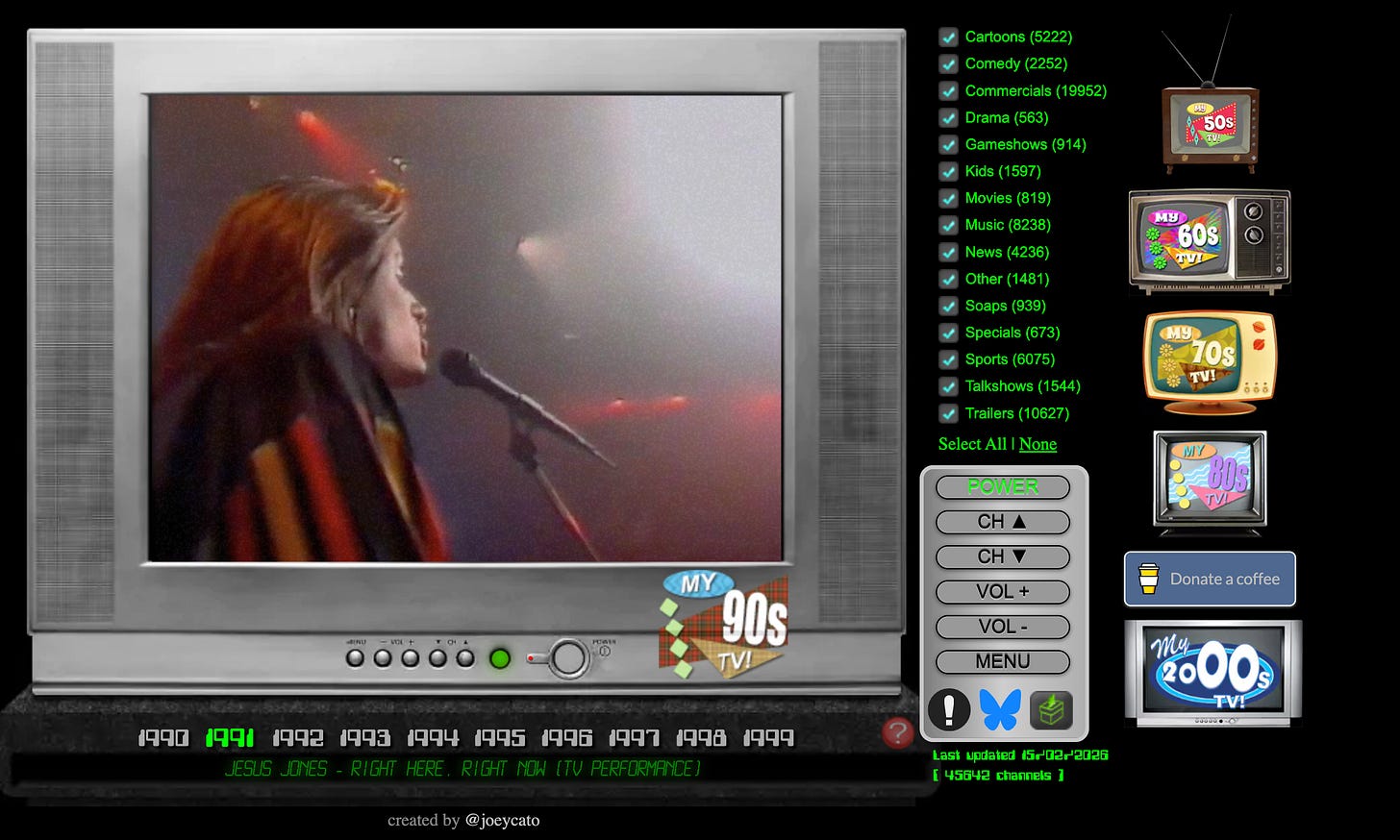 Forget the "Infinite Scroll." Sometimes you just want to sit on the floor and flip through channels in 1994. This site simulates vintage television sets from the 50s to the 00s, letting you watch exactly what was onscreen during those decades.