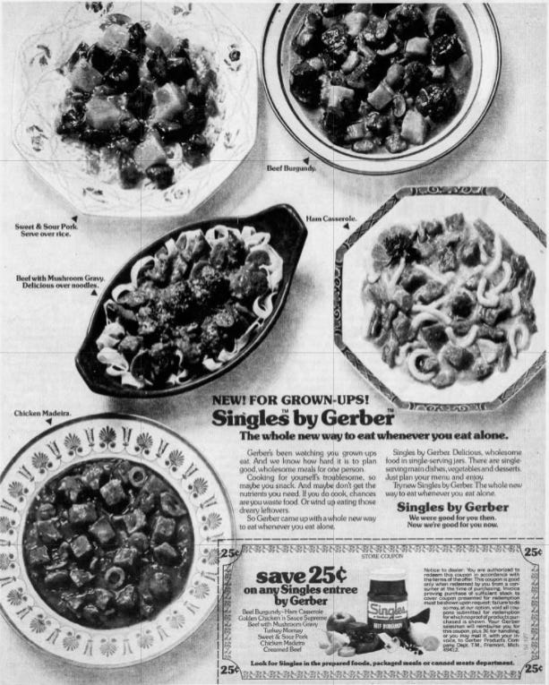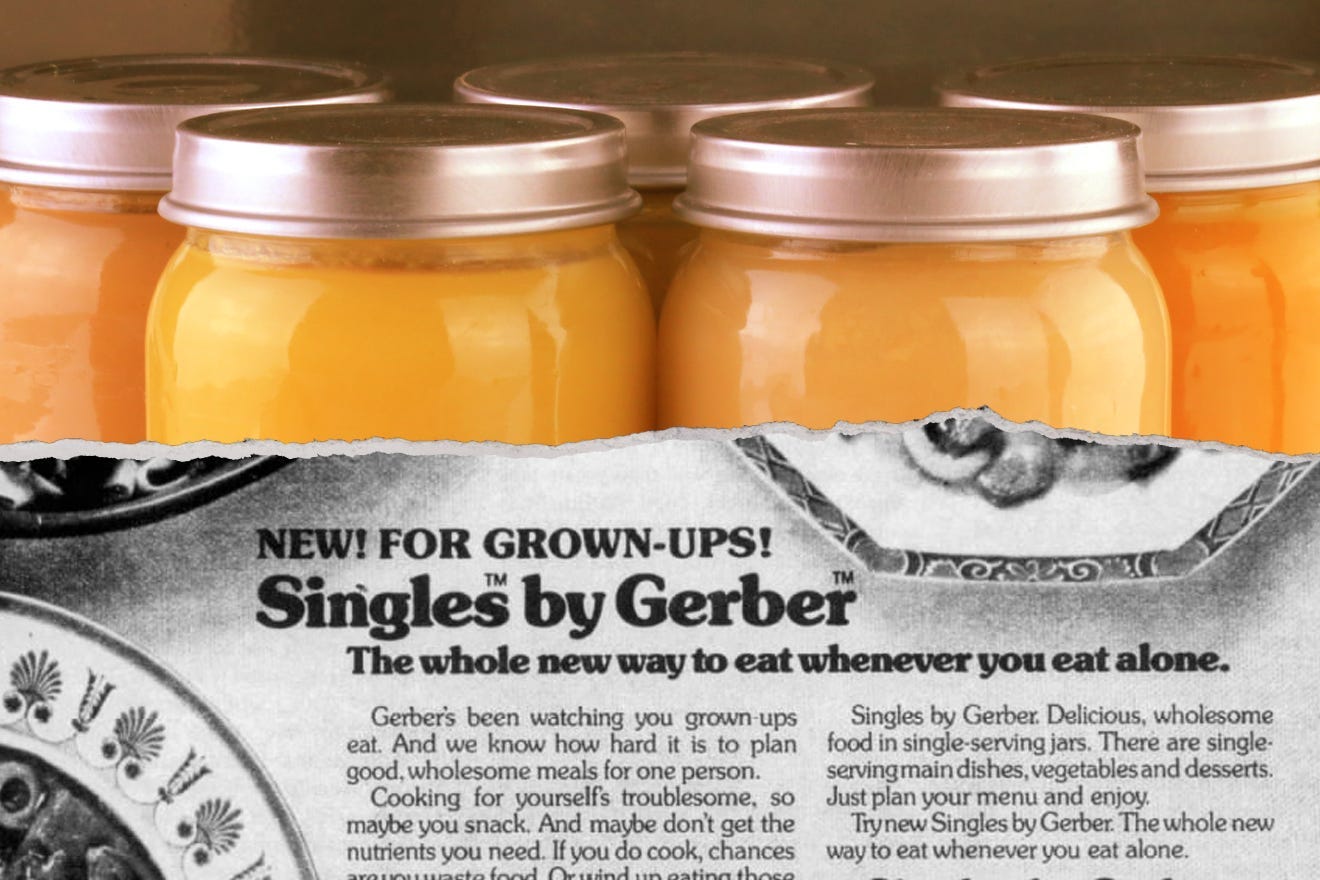 In 1974, Gerber tried branching out with a product called Gerber Singles, a line of pureed, jarred meals marketed to college kids and single adults. The pitch was simple: baby food convenience, but for grown-ups who wanted quick, single-serve meals. It didnât last long, and for good reason.