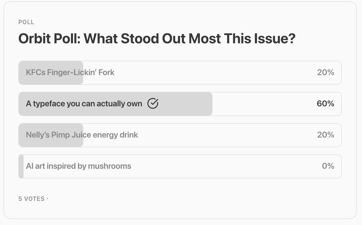 Are you a creative with a story, project, or odd little obsession worth sharing? Weâre always on the lookout for designers, makers, writers, and internet explorers to feature in upcoming editions of The Orbit. If youâd like to be spotlighted, or know someone whose work deserves the stage - drop us a line: đŠ hello@theorbitstudio.com