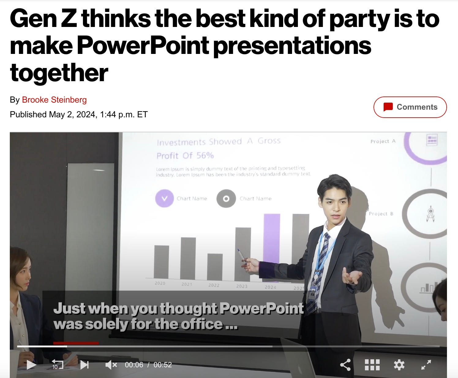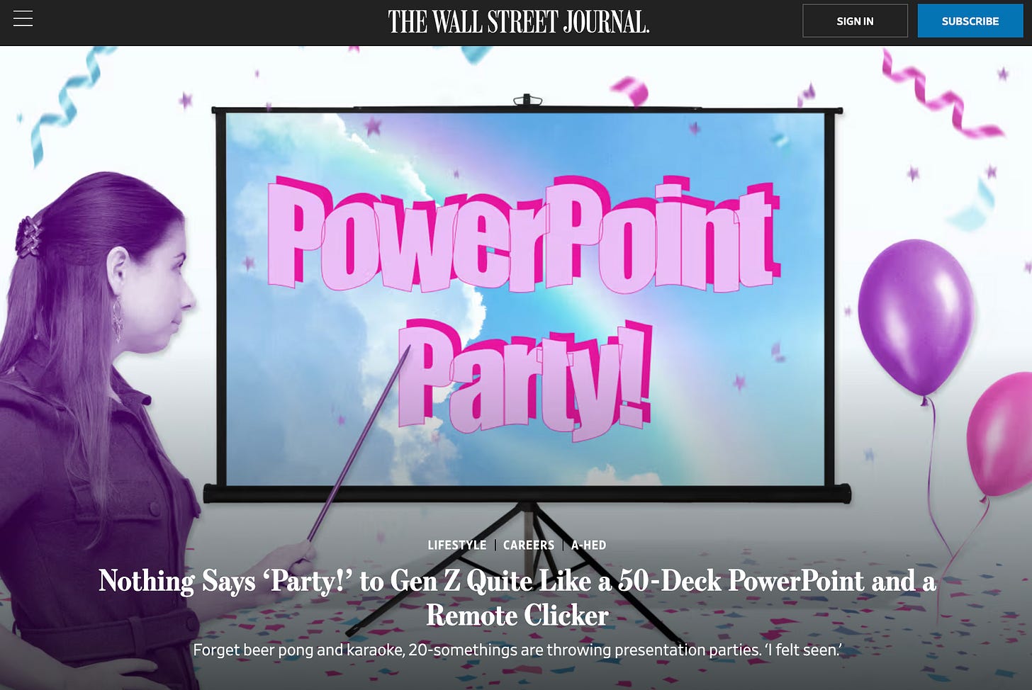 Media quickly zoomed in on this trend and some major outlets like The Wall Street Journal, Polygon, and Apartment Therapy began writing about PowerPoint parties. On TikTok and Instagram, people started sharing clips of their wild presentations, spreading the idea even further and inspiring others to jump on the bandwagon.