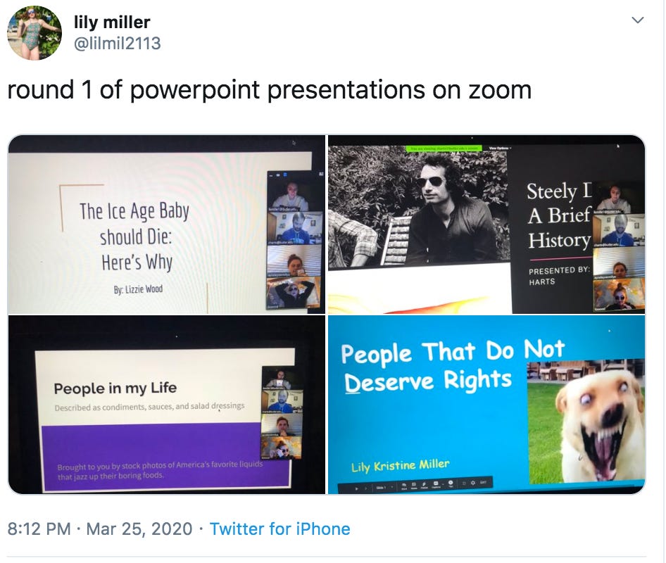When the pandemic kept everyone at home, people started finding creative ways to hang out online. Thatâs where PowerPoint parties came in. Friends began hosting virtual gatherings where theyâd share goofy presentations on topics like âWhy Crocs Are the Greatest Fashion Statement of Our Timeâ or âRanking Superheroes by Their Tax Fraud Potential.â It wasnât about the actual software but about turning something super boring into a way to laugh and connect during a tough time.