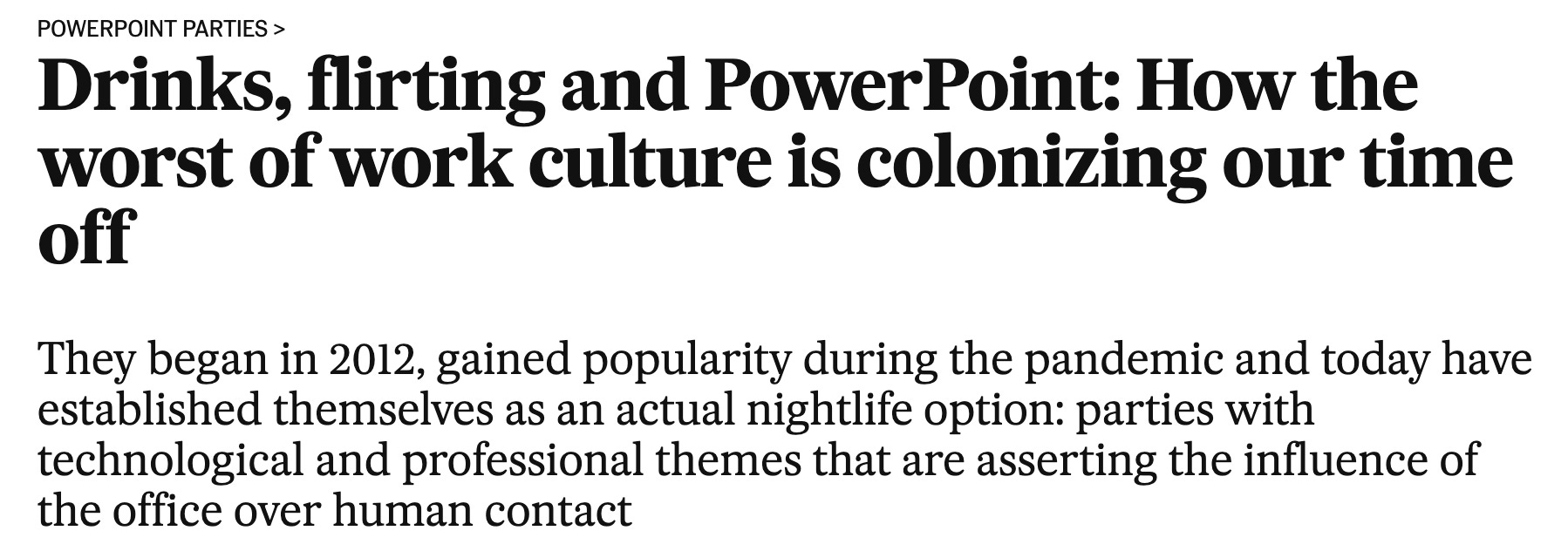 PowerPoint parties have grown far beyond their pandemic roots. Theyâve become a creative subculture where people share their humour, dive into niche interests, and bond over shared laughs. From âDeranged PowerPoint Nightâ gatherings to viral TikToks, these parties have solidified their spot as a fun and easy way to bring people together.