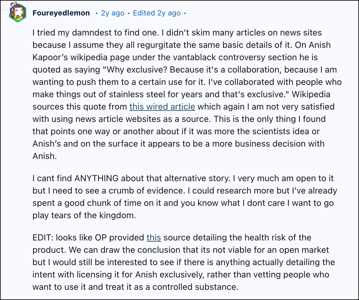 The artistic community strongly objected to this move because they saw it as monopolizing this unique material. Concerns were voiced by artists such as Christian Furr, who said, “We’ve never had a material that absorbs light quite like this… It isn’t right that it belongs to one man.”