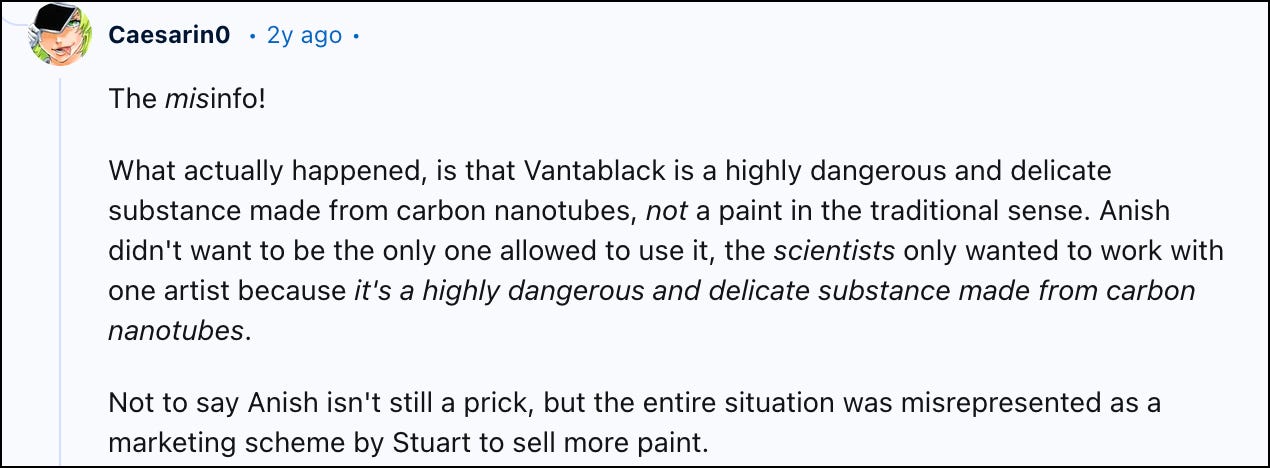 With technology constantly creating new materials, these questions will keep popping up. The Vantablack story is a good reminder that in art, just like in life, things are rarely as simple as black and white.